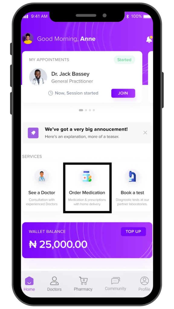 If you’re ordering on your own, open up the app and click on the ‘Pharmacy’ button at the bottom of the page. You can also click on the ‘Order Medication’ button on the home screen.