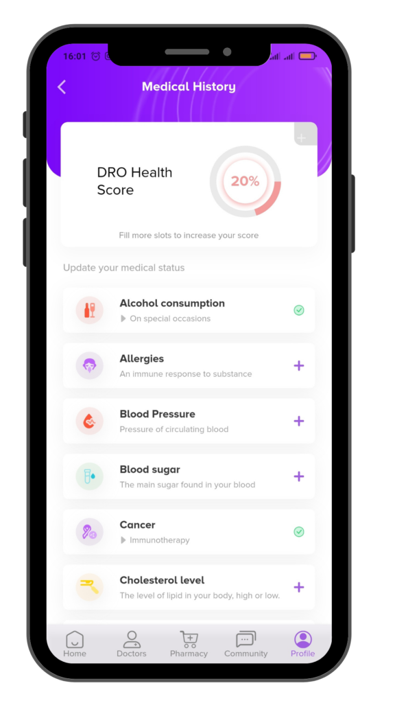 Your medical history is an integral part of your DRO Health profile. Your doctors can access your medical history to get more insight about your health. They can use it to determine what methods of treatment will work best, and those to stay away from.